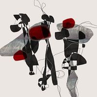 Een complex werk met abstracte vormen van verschillende grootte en een gedeeltelijk onderliggende textuur, die samen toch een coherente compositie vormen.