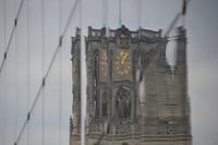 Beeld van de weerspiegeling van de Laurenskerk in de gevel aan de kopse kant van de Markthal in Rotterdam.