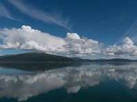 Weerspiegeling van de wolken in het Ranfjord in Noorwegen. In de vroege ochtend weerkaatsen de witte stapelwolken en de bergen in het bijna rimpelloze blauwe wateroppervlak van het fjord. Het Ranfjord ligt in het noorden van Noorwegen in de gemeente Nordland net ten zuiden van de poolcirkel.