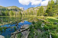 Magisch moment in Rocky Mountain National Park, waar de achterliggende bergen prachtig reflecteren in het stille water van Nymph Lake. Net na de zomer ligt het meer vol met waterlelies, wat dit tot een sprookjesachtig tafereel maakt. De blauwe lucht contrasteert op een fijne manier met het groen van de bomen en andere begroeiing.