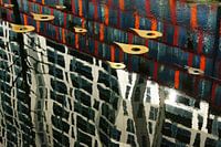 Reflectie van oranje, zilver en goud bij het gebouw de Calypso in het water van de Westersingel in Rotterdam.