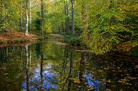 De bomen in het bos bij Hilverbeek in het Gooi, weerspiegelen in het water op een zonnige herfstdag
