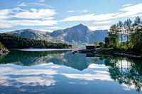 Weerspiegeling van bergen, lucht en wolken in een meer in Noorwegen.
