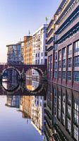 Een van de straten in het centrum van Hamburg in Duitsland, net na de zonsondergang (blue hour). Met een mooie weerspiegeling van de gebouwen in het water.