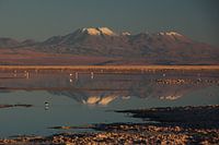 Weerspiegeling van bergtoppen van de Andes in een met water bedekt zoutmeer in Chili. Flamingo's.