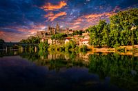 Reflectie van de oude stad en de kathedraal van Béziers in de rivier de Orb in Zuid-Frankrijk bij zonsondergang en bewolking