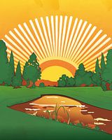 Abstract-minimalistisch retro-style landschap van de ondergaande zon die zich weerspiegelt in een plas tussen grasvelden. De style en de kleuren - geel, orange, rood, groen - zijn geinspireerd van de kunst van de jaren 1950 en 1960.