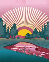 Abstract-minimalistisch retro-style landschap van de ondergaande zon die zich weerspiegelt in een plas tussen grasvelden. De stijl en de kleuren - geel, roze, rood, blauw-groen - zijn geïnspireerd van de kunst van de jaren 1950 en 1960.