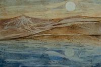 Weerspiegeling van een landschap , het land van blauwe meren , bergen, meren , zon , bezinning, hitte, abstract , modern, waterverf, het schilderen , kunst , origineel 2005-60x45 , panoramisch, blauw, Mood