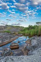 Landschap waarin wolken weerspiegeld worden in het water op eiland bij de Zweedse Scherenkust.