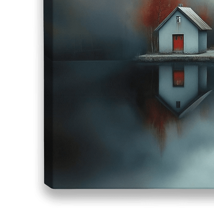 Een charmant tafereeltje van een paar witte huisjes aan de oever van een spiegelglad meer. Het water is zo stil dat het een perfecte weerspiegeling van de huisjes laat zien, waardoor het beeld een bijna magische symmetrie krijgt. De rode kleur van de huisjes is diep en intens, wat prachtig afsteekt tegen de rustige, natuurlijke tinten…