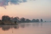 's Morgens vroeg, langs de IJssel bij Wilsum. Zonsopgang boven het verstilde water van de rivier.