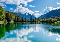 Prachtig meertje waar je rondom kunt wandelen, maar ook kunt vissen, in de buurt van Vandans in het Montafon gebied in Vorarlberg in Oostenrijk. De blauwe lucht met de witte wolken spiegelt mooi in het water.