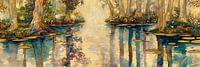 In 'Weerspiegelingen in het Woud' wordt de toeschouwer meegenomen naar een verstilde wereld waar natuur en water één worden. De majestueuze bomen, geworteld in de vruchtbare aarde, reiken met hun spiegelbeelden tot diep in de kalmte van het water. Het gouden licht dat door het bladerdek heen breekt, tovert de vijver om tot een canvas…