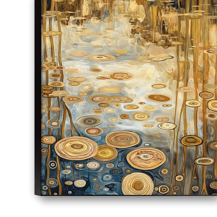 "Weerspiegelingen van het Woud" is een verbeelding van een bosrijk landschap waarin de stammen en bladeren samensmelten met een wateroppervlak dat de wereld boven en onder vangt. De kunstzinnige cirkels, die aan de randen van het beeld dansen, voegen een dromerige, bijna mystieke dimensie toe aan het tafereel. De weerspiegeling in het water creëert een symmetrische schoonheid, waardoor de grens tussen realiteit en reflectie vervaagt. Het kleurenpalet van goud, bruin, en blauwtinten versterkt het gevoel van herfstige rust. Dit beeld zou een betoverende aanvulling zijn op een ruimte die streeft naar een balans tussen natuurlijke schoonheid en creatieve verbeelding.