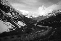 Weg door het Noorse hooggebergte, in zwart-wit, met besneeuwde bergen in het landschap. Een winters landschap met veel ruimte.