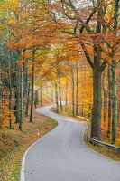 Weg tussen Porschdorf en Lohmen in Saksisch Zwitserland in de herfst. De vroege ochtendzon breekt in het bos en laat de felgekleurde bladeren schijnen.