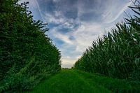 Weg door hooggegroeide maïsvelden tijdens de oogst in de herfst bij zonsopgang