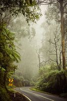 De varens langs de kant, de bast van de bomen die aan de takken hangen, en de bomen die verdwijnen in de mist maken dit tot een mysterieus plaatje
