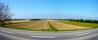 Panorama van een landschap met velden langs een landweg in het Tullnerfeld bij het dorp Chorherrn, Oostenrijk.