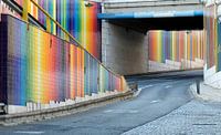 Straat versierd in regenboogkleuren in Lissabon, Portugal