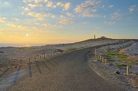 De smalle weg baant zich een weg door het kale landschap van Gran Canaria, rechtstreeks naar de Faro de Arinaga. In het zachte licht van de zonsopgang wordt de foto een moment van stilte: de lucht baadt in zachte pastelkleuren, terwijl het gouden licht de eerste schaduwen op het asfalt werpt. De vuurtoren aan de horizon ziet eruit als…