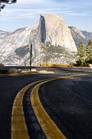 Deze foto, genomen vanaf Glacier Point, toont de iconische Half Dome, één van Yosemite National Park’s meest herkenbare silhouetten, gezien vanaf een uniek perspectief langs de weg. Het asfalt, gemarkeerd met de heldere gele lijnen, lijkt te leiden naar de massieve granieten koepel zelf. De nabijgelegen Yosemite Falls, de hoogste waterval in Noord-Amerika, en de weelderige groene valleien die zich uitstrekken tot aan de Merced River, dragen bij aan het overweldigende landschap dat deze nationale schat biedt. Dit punt biedt ook een blik op de indrukwekkende El Capitan en biedt avonturiers de kans om de Mist Trail te volgen of de uitdagende beklimming naar de top van Half Dome te ondernemen. Deze foto nodigt de kijker uit om de reis te maken, om de adembenemende uitzichten persoonlijk te ervaren, en om de verbinding met de natuur te voelen die alleen Yosemite kan bieden. De foto zou een prachtige aanvulling zijn in elk huis of kantoor, een constante herinnering aan de grootsheid van de natuur en het avontuur dat op ons wacht net buiten onze voordeur.