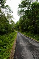 Deze weg in Noorwegen was onderdeel van onze wandeling naar de kust, waar we de zonsondergang zouden gaan bekijken. De regen weerhield ons er niet van te genieten van deze prachtige groene natuur.