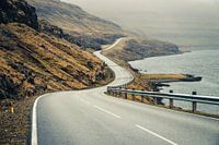 Foto van een kronkelende weg op de Faeröer Eilanden. Als je een reis maakt over deze eilandengroep, dan kom je regelmatig dit soort plaatjes tegen..