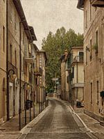 Dit is een blik op de weg die het centrale plein van Tavernelle in Umbrië, Italië, verlaat. Tavernelle is een oud marktstadje aan de rand van Panicale. De wegen naar en van het plein zijn eenrichtingsverkeer en dit is een van de uitvalswegen. Het komt uit op wat vroeger een hoofdweg was, die door het centrum van Tavernelle liep, nu veel rustiger dankzij een rondweg.