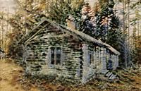 Een rustieke houten hut is afgebeeld te midden van een bebost gebied, met bomen en gebladerte die de hut gedeeltelijk aan het zicht onttrekken. De impressionistische stijl brengt een gevoel van ouderdom over en laat het bouwwerk opgaan in de omringende natuur.