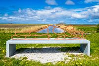 Landschapsfotografie in Nederland. In het Hogeland, het Noorden van de provincie Groningen zijn er vijf, van staalplaat gesmede mens sculpturen te vinden, die liggend ontspannen in het weidse landschap. Deze scupturen zijn gemaakt door beeldend kunstenaars Maree Blok en Bas Lugthart. Deze liggende vrouw kun je vinden bij het laatste stukje weg naar Noordpolderzijl, de kleinste Waddenzee haven van Nederland. De kunstwerken kunnen zelf worden gebruikt als rustpunt (bankje). Deze foto is gemaakt op een zonnige dag in April 2024.