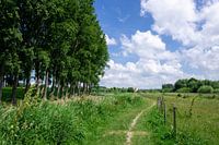 Wegje dat langs de velden in Damme loopt. Langs de akkers aan de ene kant, en de bomen en riet langs de andere kant.
