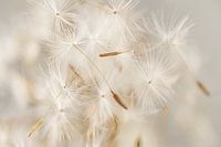 "Wegwaaiende pluisjes in zachte natuurlijke kleuren" is een macrofoto van pluisjes van een paardenbloem, die de pluizenbol hebben verlaten en nu klaar zijn om de wereld in te trekken en een nieuw plekje te zoeken.
