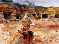 Ontdek de meditatieve kracht van het Marokkaanse woestijnlandschap. Deze zeer abstracte aquarel legt de symbolische vorm van een steenmannetje vast tegen de historische achtergrond van de mijnen van Midelt. Door de reductie tot essentiële vormen en een warm, aards kleurenpalet van gebrande sienna, oker en diepe umbra-tinten ontstaat…