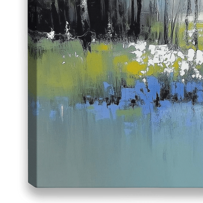 Als je dichterbij komt zie je de manier waarop het oppervlak is gebouwd: verticale krassen, brede paletmesstreken bij de stammen, en kleine puntige vlekken voor het gras en de bloemen. De bomen zijn niet minutieus uitgewerkt maar gesuggereerd met donkere, bijna zwarte lagen die oplichten met dunne, koele blauwtinten en een vleugje groen; dat geeft ze diepte en ritme — een echt bomen schilderij. De weide is geschilderd met losse, bijna abstracte vlekken van oranje en geel, afgewisseld met heldere witte accenten die waterplassen en bloei voorstellen. De spiegeling in het water onderaan is zacht horizontaal vervaagd, alsof iemand het oppervlak met een brede doek heeft aangeraakt; daardoor wordt dit ook een schilderij water en een schilderij spiegeling.