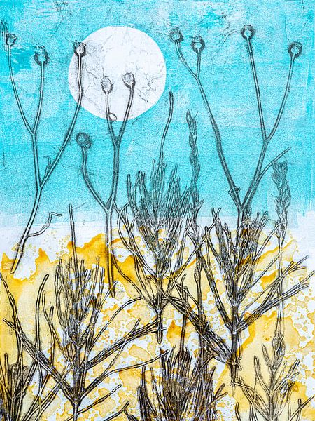 Deze botanische monotype of monoprint is gemaakt met een gelli plate en acrylverf. Een uniek en eenmalig werk, er kan maar 1 afdruk worden gemaakt van je ontwerp. Door de grafische druktechniek en het gebruikte papier ontstaan er allerlei structuren en effecten. Bij dit werk heb ik bloemetjes, planten en grassen geplukt in de berm en…