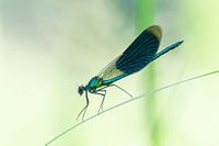 Een weidebeekjuffer mannetje op een blad van een rietplant.