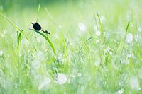 Een weidebeekjuffer in de vroege morgen. Condens van de nachtelijk uurtjes ervoor hangen als druppels aan het gras. De weidebeekjuffer zit in een grasland, waar een beekje langs stroomt.