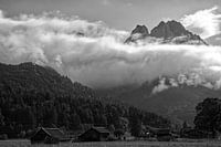 Typisch landschap nabij Garmisch-Partenkirchen in Beieren, Duitsland. Weelderige weiden met kleine schubben en stenen voor de met dichte bossen bedekte hellingen aan de rand van de bergen en het Wettersteinmassief met de Zugspitze, de hoogste berg van Duitsland, verborgen door laaghangende wolken. Ondanks de reductie tot grijstinten is…