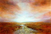 Een uitgestrekt landschap in warme kleuren. De horizon is ver weg, men ziet de hemel met gouden wolken. De stijl van schilderen is geabstraheerd, er is ruimte om het landschap verder vorm te geven in het oog van de toeschouwer. Associaties van vakantie, ontspanning, meditatie komen in me op.