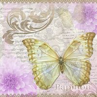 Foto eines weißen Morphos und Dahlienblüten, kombiniert mit Vintage Stilelementen, digital bearbeitet.