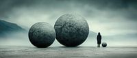 Drie bollen van verschillende grootte met gebarsten oppervlakken domineren het gezichtsveld in deze mistvlakte. Ze staan op onregelmatige afstanden op een rij, waarbij de twee grootste op de voorgrond een aanzienlijke aanwezigheid uitstralen. Iets verschoven achter hen staat een kleinere versie, bijna als een verloren fragment van hetzelfde mysterieuze materiaal. De gevels van de bollen lijken vele cycli van uitzetting en inkrimping te hebben doorstaan, zodat ze nu een grillig patroon vertonen dat ooit kon getuigen van hitte en vocht.