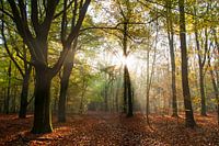 Zonnestralen schijnen tussen de bomen door. Door de vochtige lucht lijken de zonnestralen bijna tastbaar.