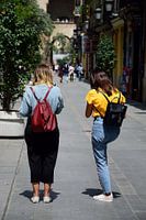De stad Valencia, Spanje trekt veel toeristen en het is niet altijd duidelijk welke kant ze op moeten. Deze twee jonge vrouwen waren verdwaald en controleerden hun telefoon om te zien of ze op de goede weg waren.