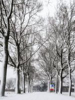 Deze verstilde winterfoto toont een indrukwekkende rij bomen, volledig bedekt met rijp en sneeuw, langs een landelijk pad in het Land van Cuijk bij Beers (Noord-Brabant). De zachte wit- en grijstonen geven het beeld een bijna dromerige, minimalistische uitstraling. De lichte nevel en het subtiele winterlicht versterken het gevoel van…