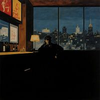 Gewikkeld in het warme licht van de plafondlamp en de levendige kleuren van advertenties, zit de man comfortabel in de intieme sfeer van het café. Achter hem doemt echter het uitgestrekte stadslandschap op - een zee van koele grijzen en gedempt blauw, verlicht door talloze ramen. Deze achtergrond herinnert aan de levendige chaos buiten en vormt een scherp contrast met de gezellige eenzaamheid binnen.