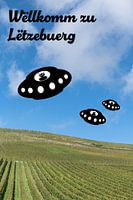 Rows and rows of vines cover the hills surrounding the River Moselle as flying saucers fly overhead.