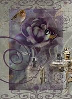 Een combinatie van meerdere foto's ( parfumflesjes, bloesem, vogels) en patronen. Leuk voor in een slaapkamer, badkamer of b.v. schoonheidssalon