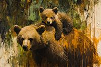 Dit prachtige schilderij toont een berenwelp die liefdevol op de rug van zijn moederbeer zit. Het ontwerp combineert warme, natuurlijke tinten zoals bruin en groen, waardoor het perfect aansluit bij een rustieke of natuurlijke inrichting. De dynamische penseelstreken geven het geheel een levendige en energieke uitstraling, terwijl de…